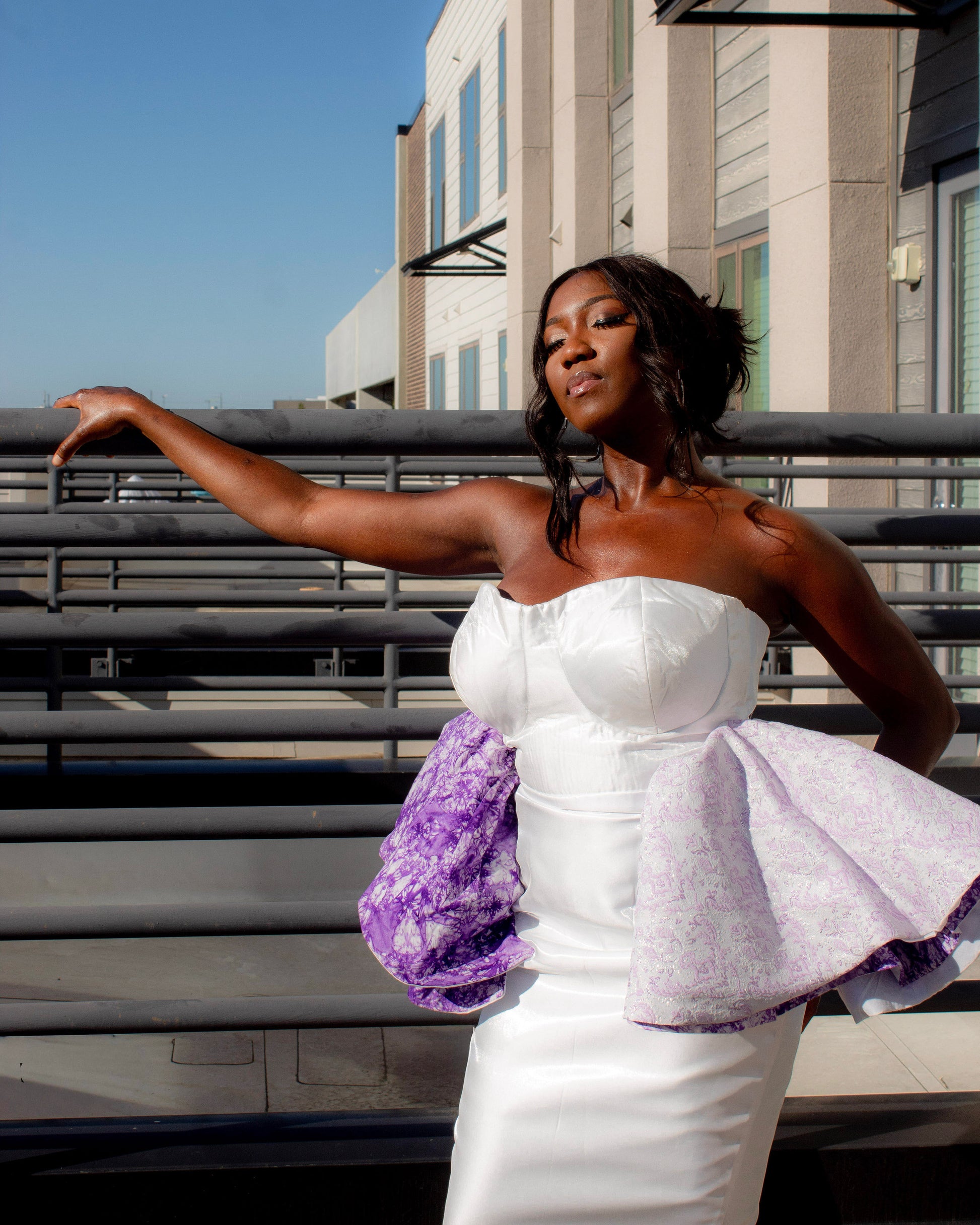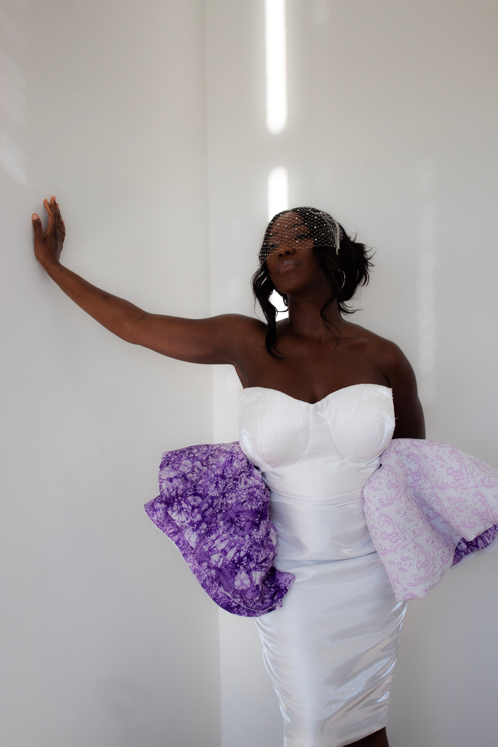 A pearl white midi fitted dress crafted from Mercado fabric serves as the base, featuring structured peplums on each side. The peplums are fashioned from luxurious brocade and vibrant tie-dye prints, layered with stiff to form either single or double for added dimension and structue.